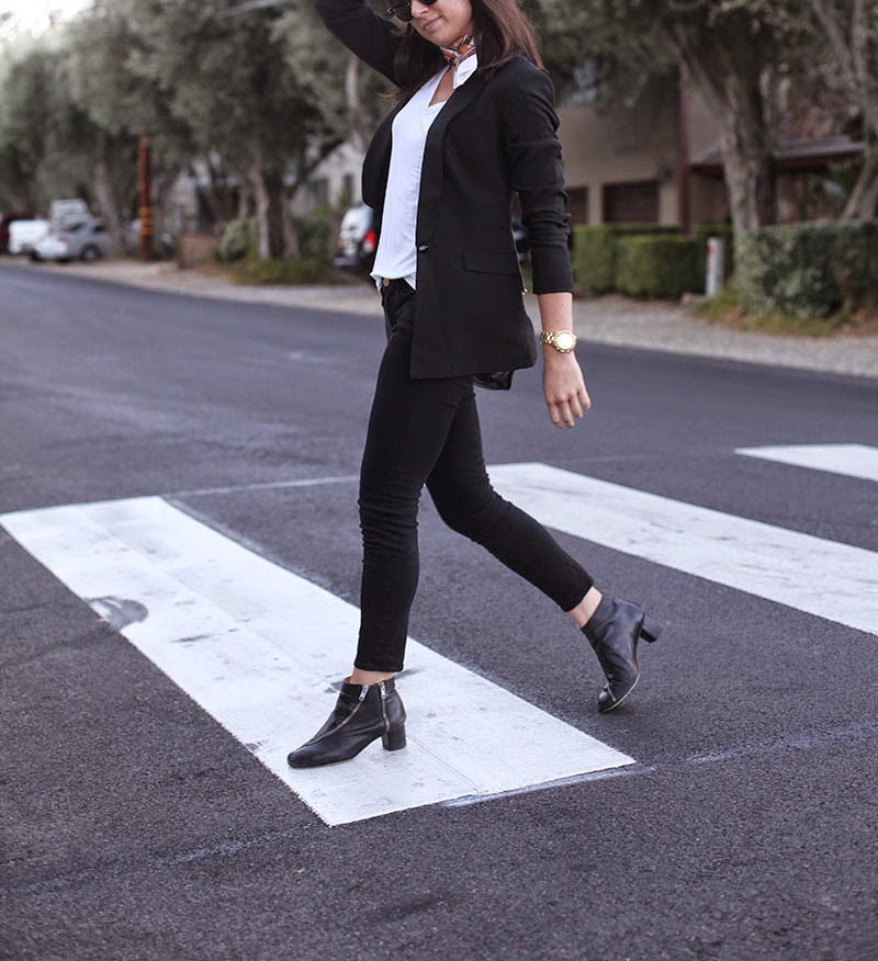 Blazer: Forever 21, Tank: T by Alexander Wang, Jeans: Frame Denim, Boots: Acne, Scarf: H&M, Bag: Balenciaga